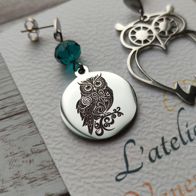 D'un côté, la rondeur miroir révèle une gravure de hibou perché tandis que l'autre expose le mystère de la nuit avec un motif de hibou ajouré. Chaque pièce est surmontée d'un cristal à facette pour une touche de brillance subtile.