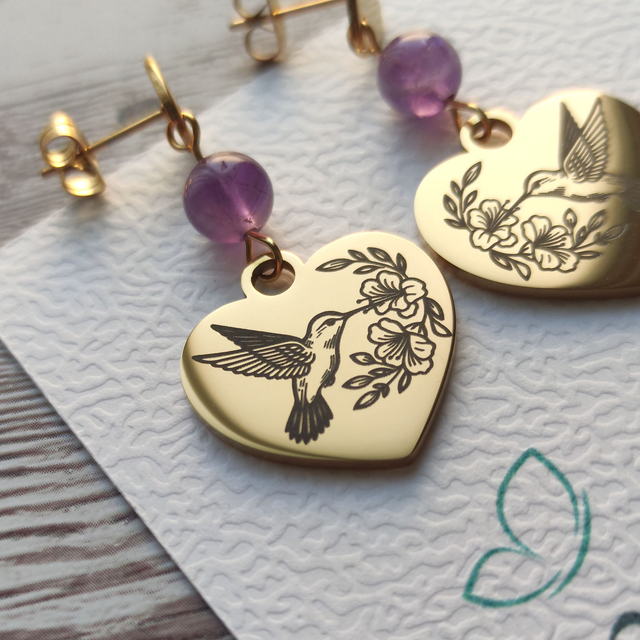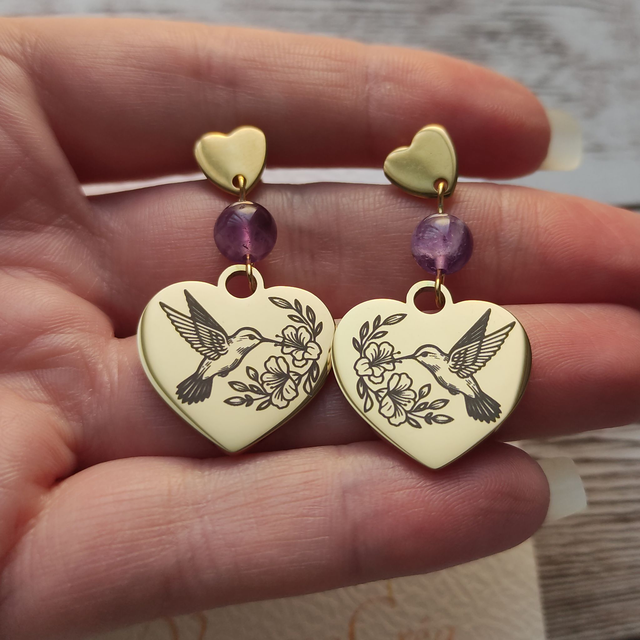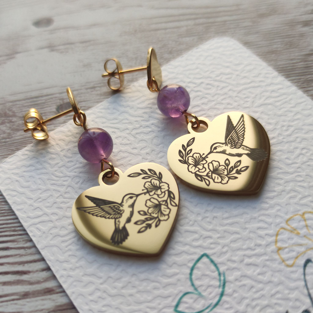 Elles arborent ma gravure artisanale d'un colibri butinant, couronnée par une véritable pierre d'Améthyste apaisante.