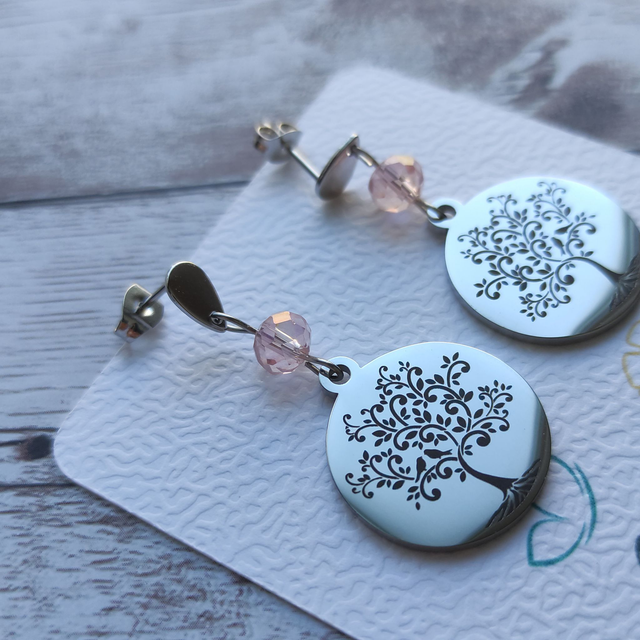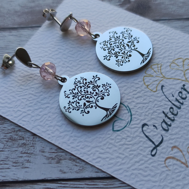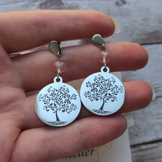 Adoptez un bijou qui raconte une histoire ! Ces boucles en acier inoxydable poli présentent ma gravure d'Arbre de Vie faite main (avec oiseaux perchés).