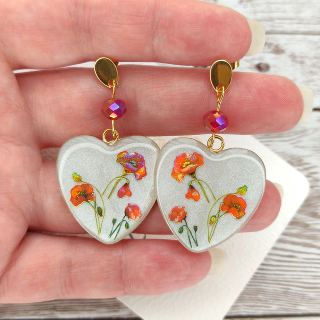 Ces boucles d'oreilles clous combinent délicatesse et poésie. Façonnées en acier inoxydable doré, leur motif de cœur abrite un secret enchanteur : une résine d'un blanc nacré scintillant dans laquelle sont figés de délicats coquelicots.