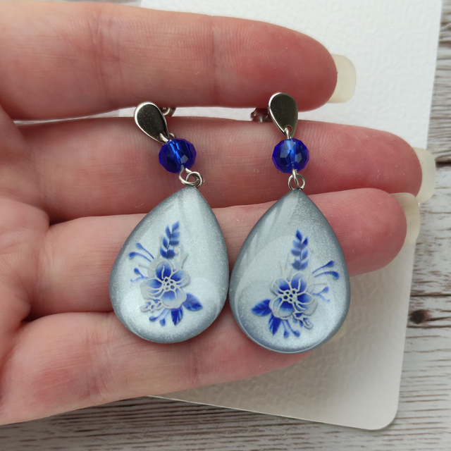 Craquez pour l'originalité de ces boucles d'oreilles ! Montées sur un clou en acier inoxydable, leur forme goutte renferme un univers magique. L'effet blanc nacré et scintillant met en valeur un motif floral captivant aux nuances de blanc et de bleu. Un bijou léger et éclatant qui capte la lumière à chaque mouvement.