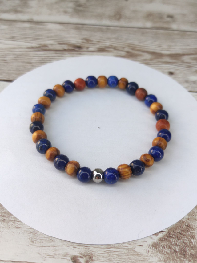 Bracelet lithothérapie en pierre naturelles "Lapis Lazuli" bois de tilleul et acier inoxydable.