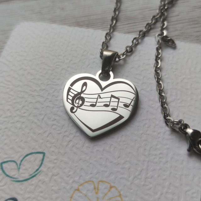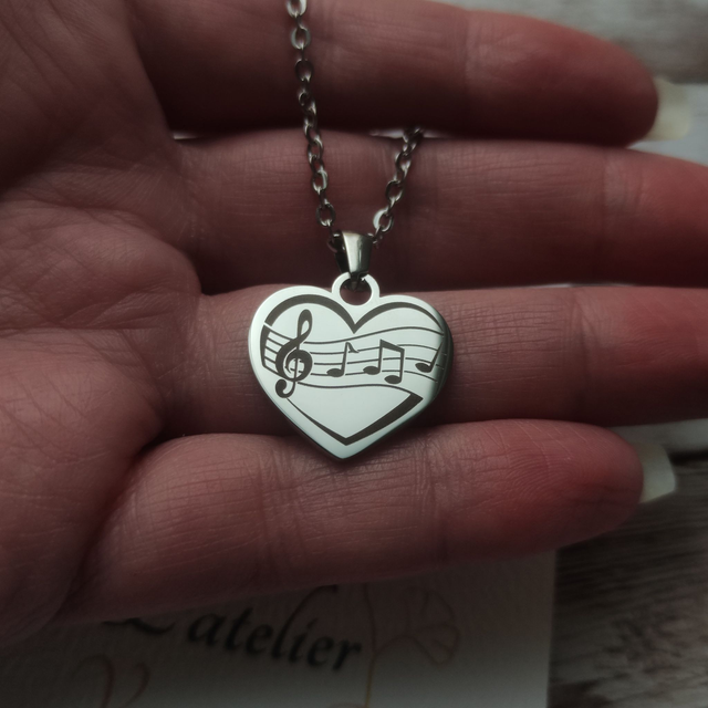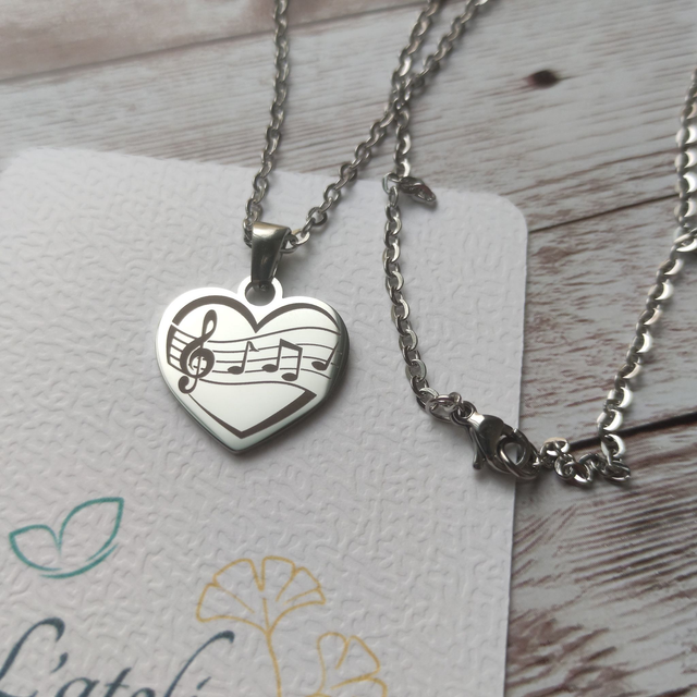 Succombez au charme unique de notre Collier Cœur Miroir en acier inoxydable. Son pendentif en forme de cœur poli miroir reflète la lumière et le monde, tandis que la gravure exclusive d'un cœur entrelacé de notes de musique capture votre passion pour la mélodie.
