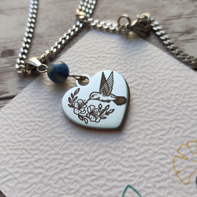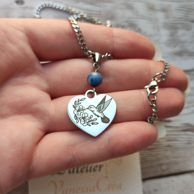 Ce pendentif poli miroir, gravé d'un colibri butinant (symbole de joie, persévérance et légèreté), est magnifié par une pierre de Lapis-Lazuli naturel (pierre de sagesse et de communication).