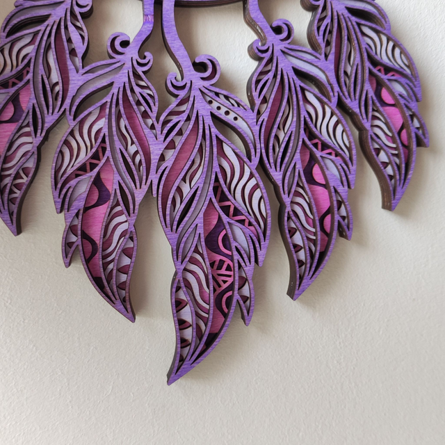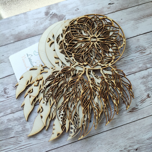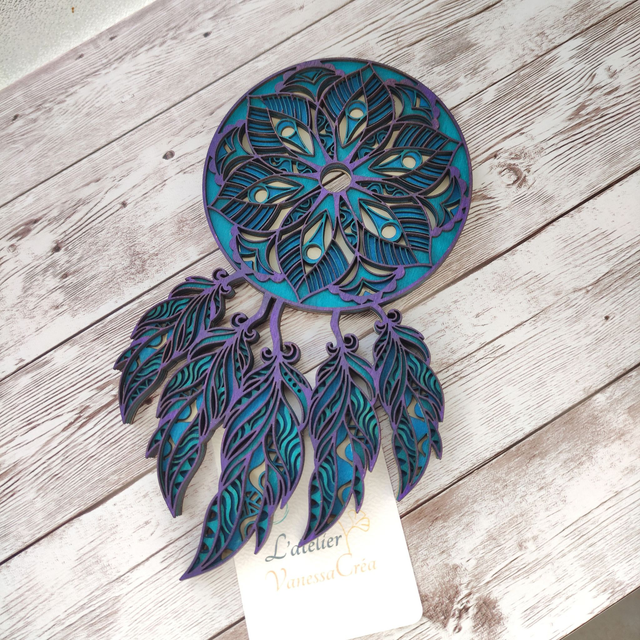 Chaque attrape-rêve est une création personnelle, méticuleusement conçue à partir de quatre couches de bois découpées. Ces différentes strates sont ensuite peintes dans la palette de couleurs que vous choisissez, puis assemblées et collées avec une délicatesse et un soin extrême.
