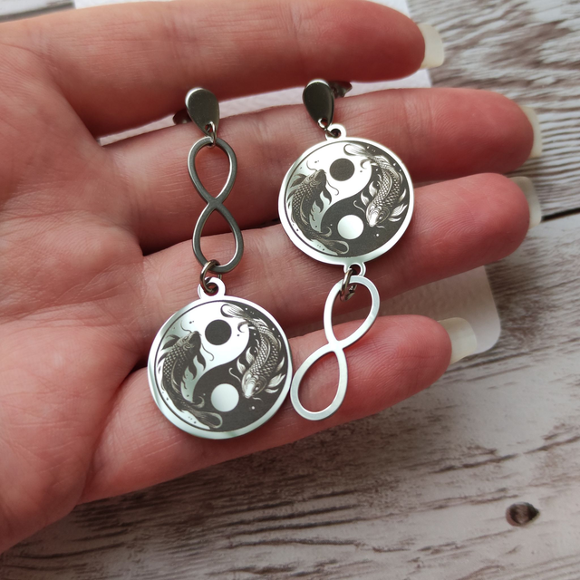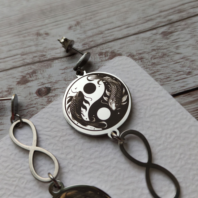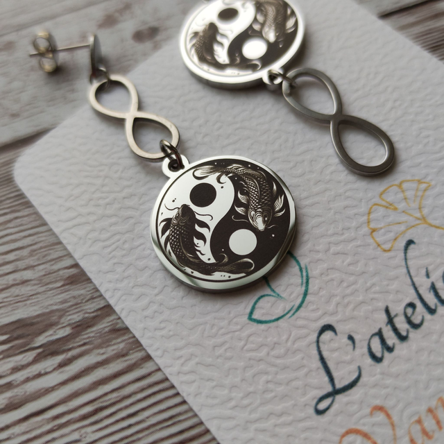 Plongez dans l'harmonie ! Ces boucles d'oreilles asymétriques uniques marient le Yin et le Yang à la puissance des Carpes Koï, sublimées par une gravure que j'ai réalisée.