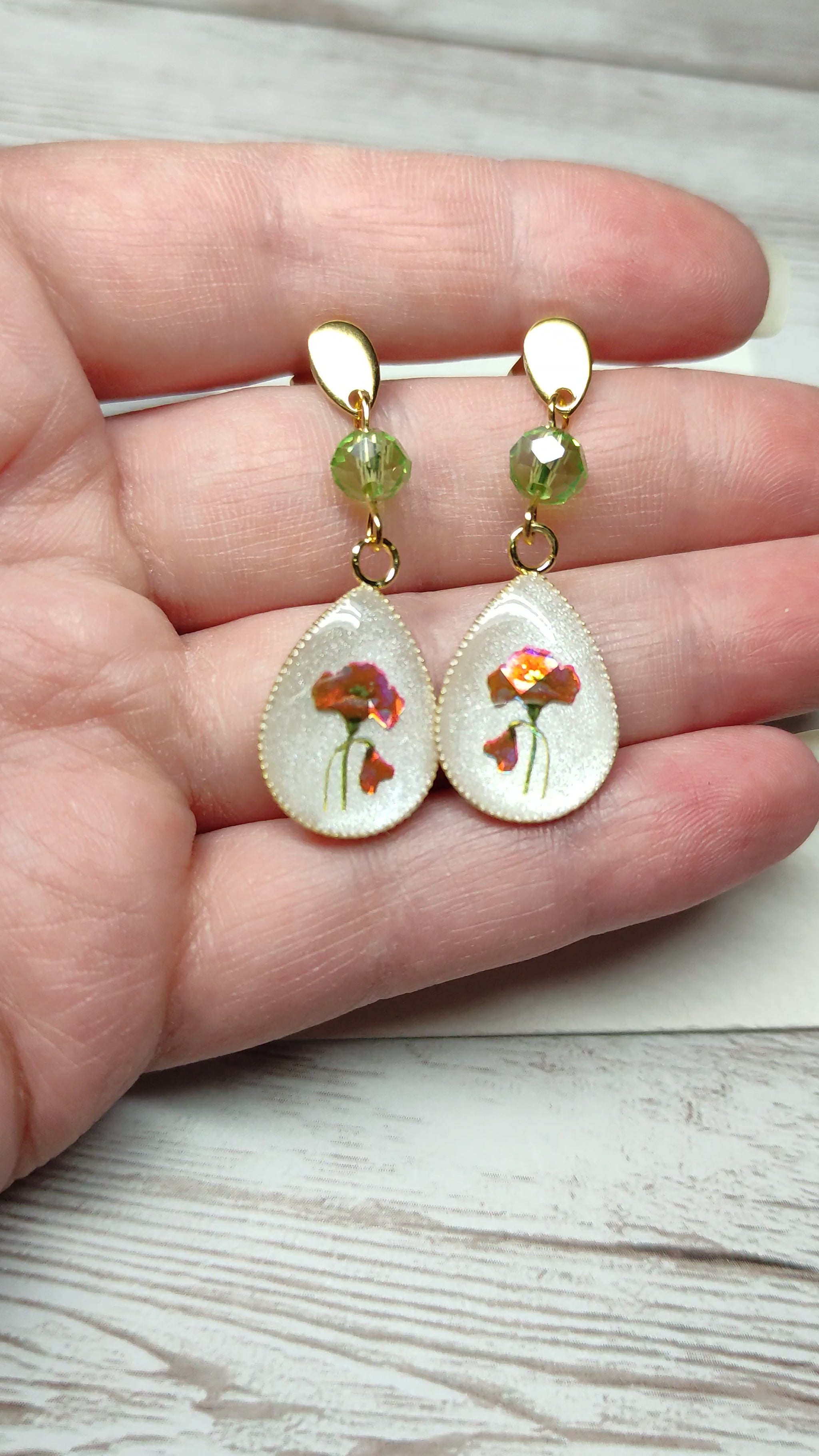 Le corps de la goutte, d'un blanc nacré scintillant, enferme délicatement des coquelicots rouges pour une touche de poésie florale et de couleur contrastée. Légères et pleines de charme, elles sont l'accessoire parfait pour ajouter une note d'élégance printanière à toutes vos tenues