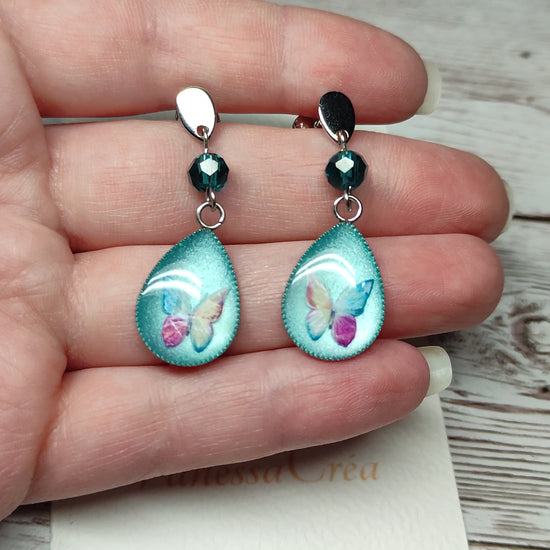 Leur silhouette en goutte renferme un trésor de légèreté : un papillon capturé dans un éclat de vert pastel scintillant. Sur le dessus, un cristal à facettes vient parfaire l'ensemble, captant la lumière pour une touche d'éclat supplémentaire.