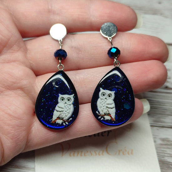 Plongez dans un univers onirique avec ces superbes boucles d'oreilles "Chouette Lunaire". Elles capturent l'instant magique d'une nuit étoilée : un fond bleu nuit scintillant accueille la silhouette délicate d'un hibou chouette blanche veillant sur sa lune.