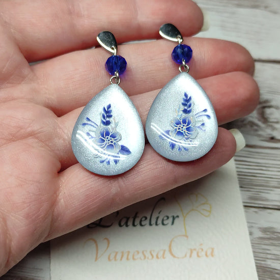 Craquez pour l'originalité de ces boucles d'oreilles ! Montées sur un clou en acier inoxydable, leur forme goutte renferme un univers magique. L'effet blanc nacré et scintillant met en valeur un motif floral captivant aux nuances de blanc et de bleu. Un bijou léger et éclatant qui capte la lumière à chaque mouvement.
