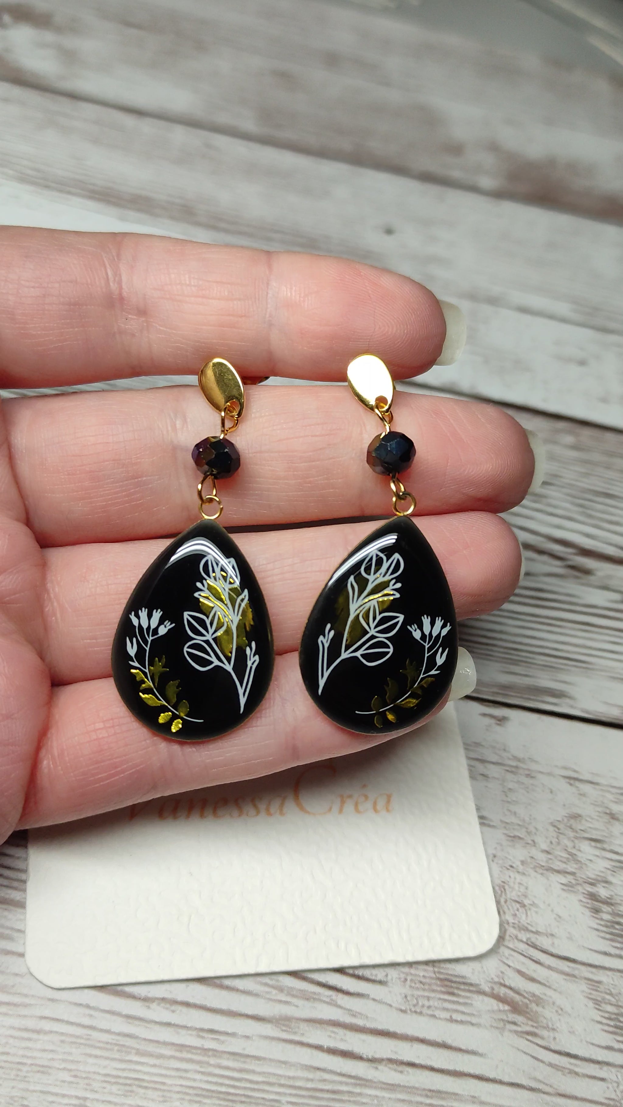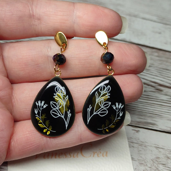 Adoptez un style raffiné et mystérieux avec ces magnifiques boucles d'oreilles clou en acier inoxydable doré. Leur forme de goutte contient une résine noire élégante où s'épanouissent de délicates fleurs et feuilles blanches et dorées.