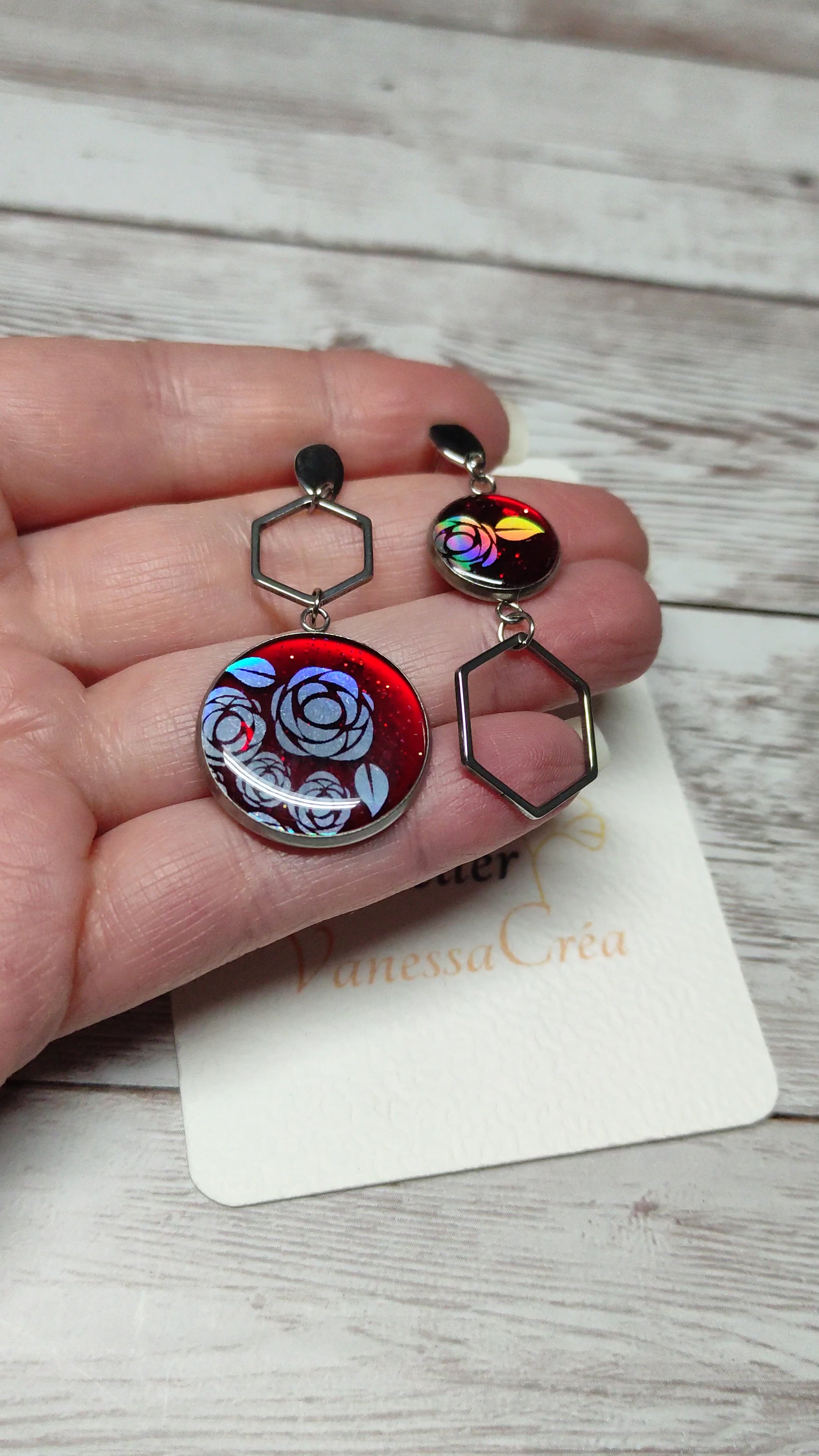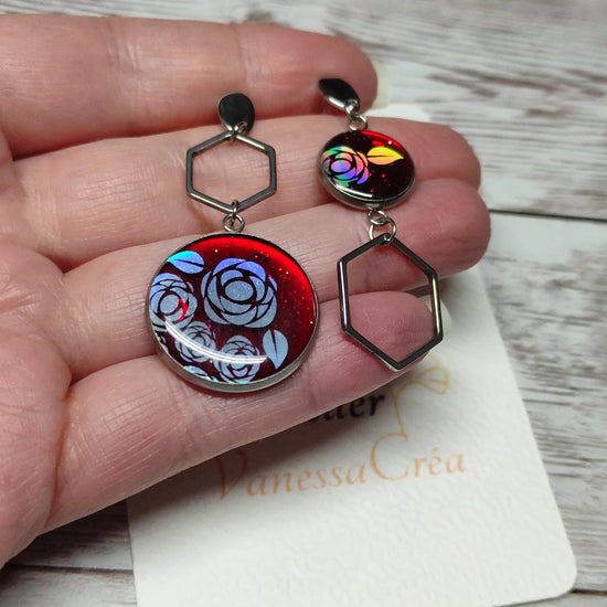 Laissez la magie opérer à chaque mouvement. Succombez au charme unique de ces boucles d'oreilles asymétriques au rouge vibrant et pailleté. Véritables bijoux de lumière, leurs fleurs délicates possèdent un secret : elles changent de couleur selon l'exposition, offrant un spectacle visuel permanent.