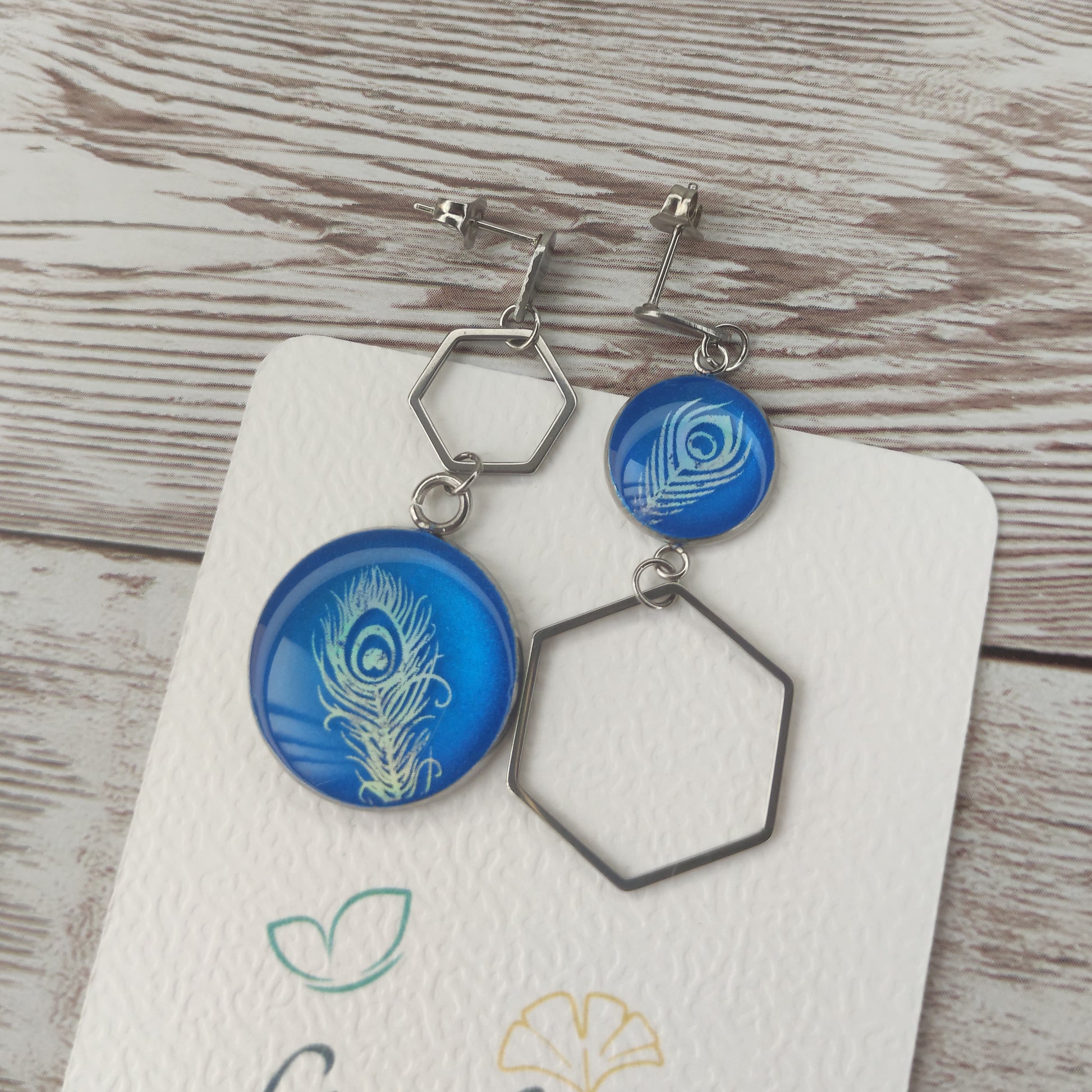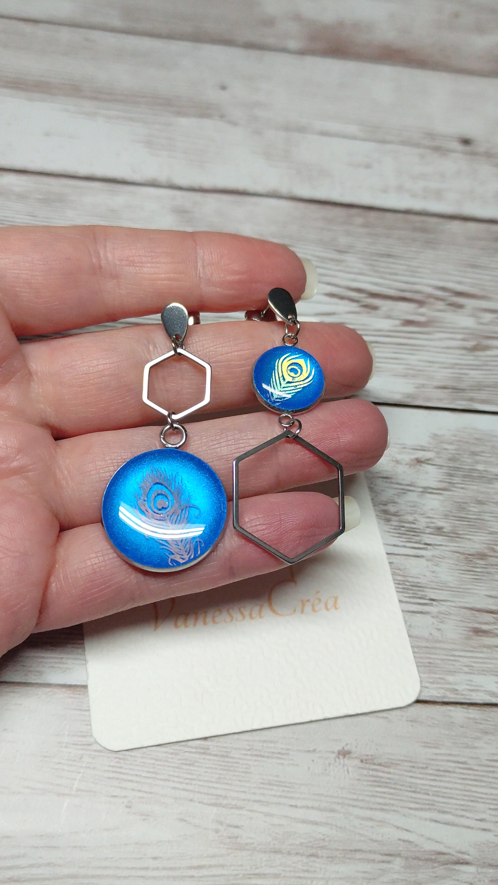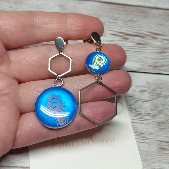 Sublimez votre allure avec une touche de magie. Laissez-vous séduire par l'élégance audacieuse de ces boucles d'oreilles asymétriques. Alliant un bleu scintillant profond à une plume aux reflets changeants, ce bijou unique danse avec la lumière pour révéler des nuances infinies à chacun de vos mouvements.