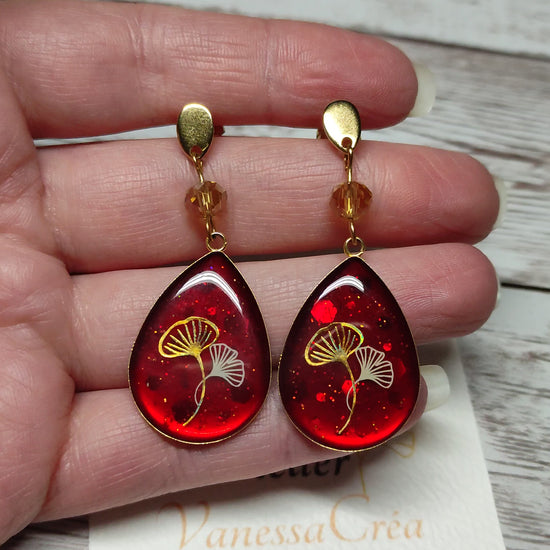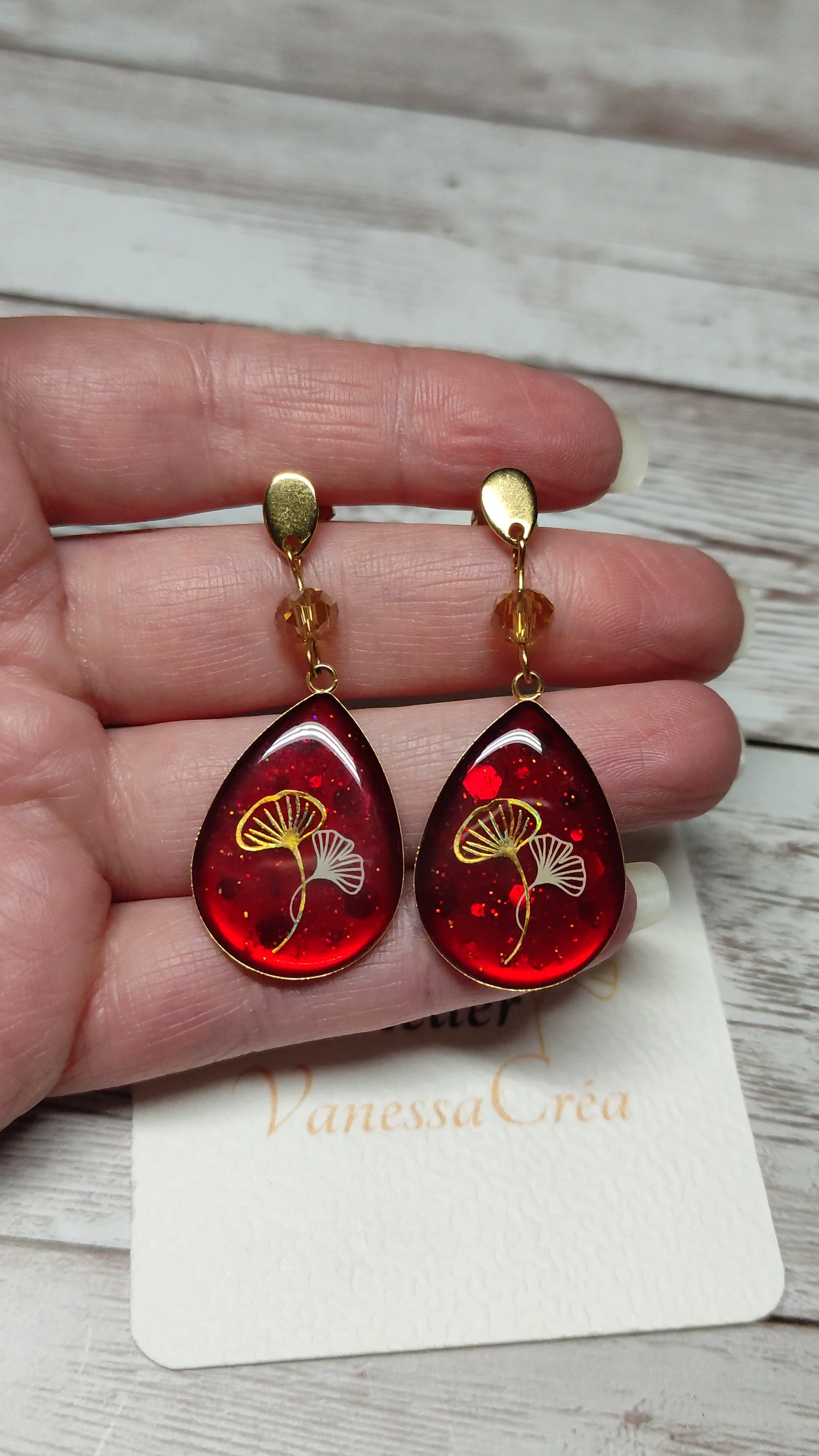 Laissez-vous séduire par l'élégance poétique de ces boucles d'oreilles uniques. Alliant la passion d'un rouge scintillant à la délicatesse des feuilles de Gingko Biloba dorées et blanches, chaque pièce est surmontée d'un cristal facetté qui capte la moindre lumière.