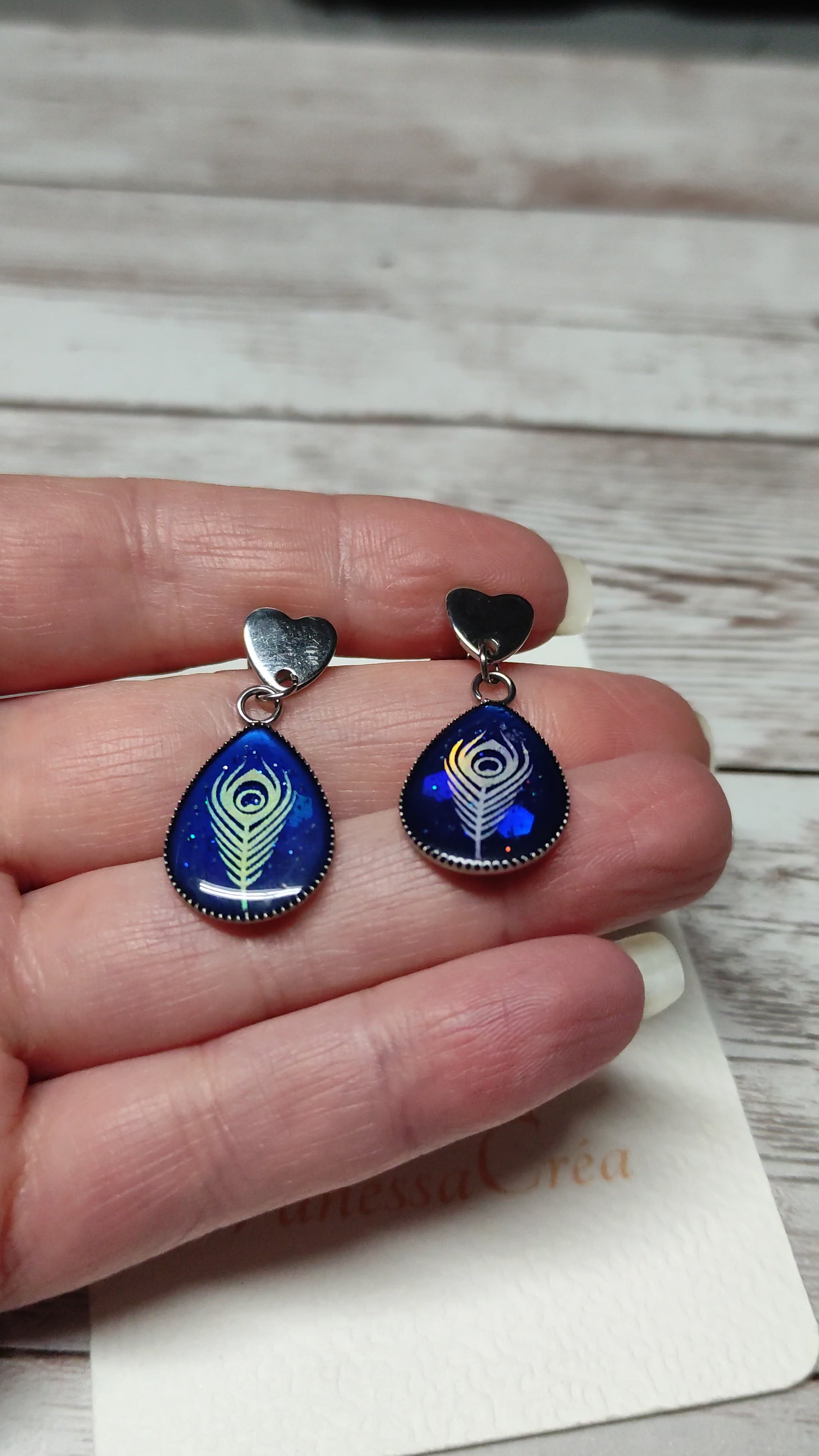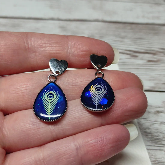 Laissez la magie opérer à chaque mouvement. Succombez au charme de ces boucles d'oreilles uniques, mêlant élégance et fantaisie. Elles dévoilent une goutte bleu scintillant surplombée d'une plume aux reflets changeants qui s'anime et se transforme selon la lumière.